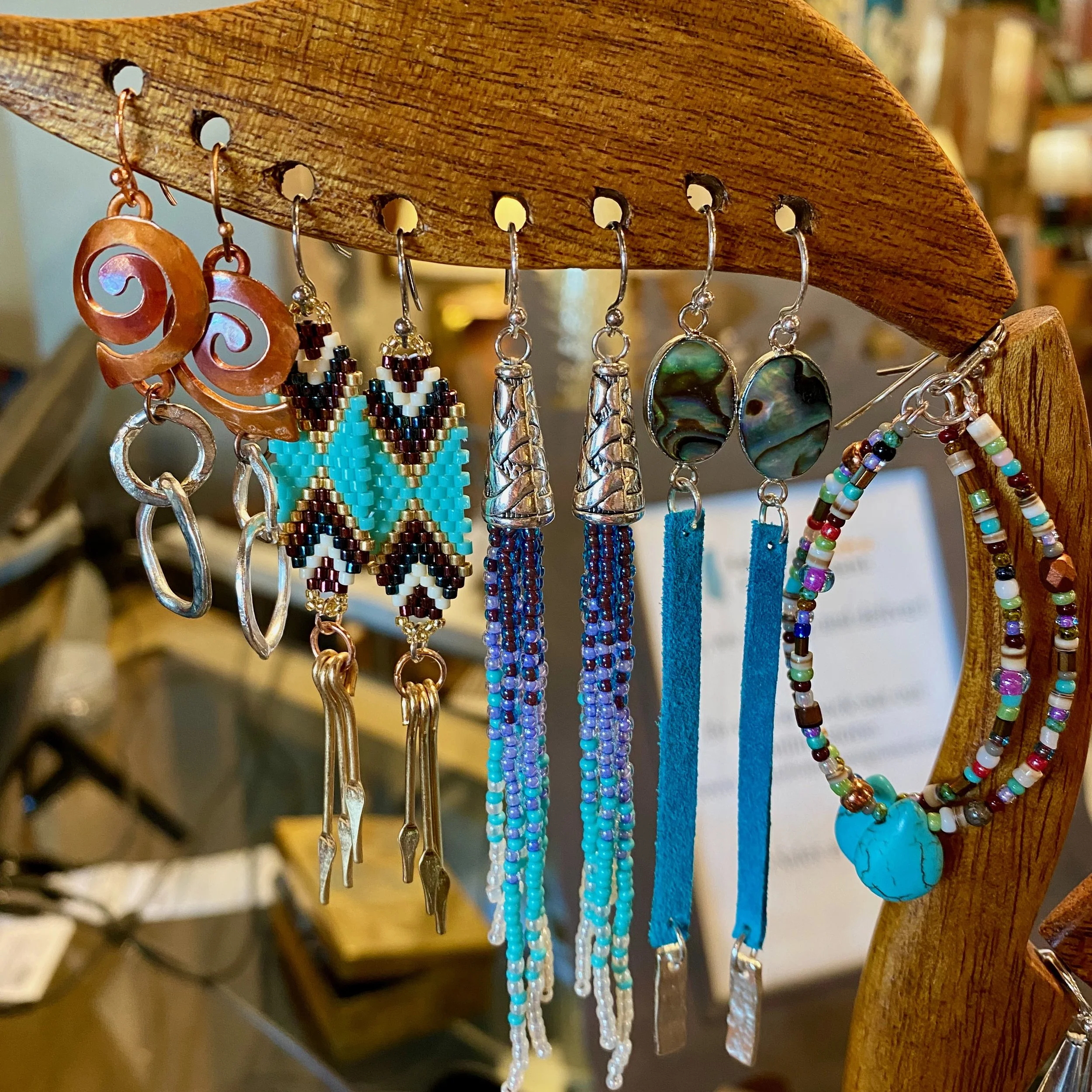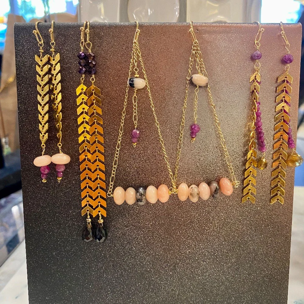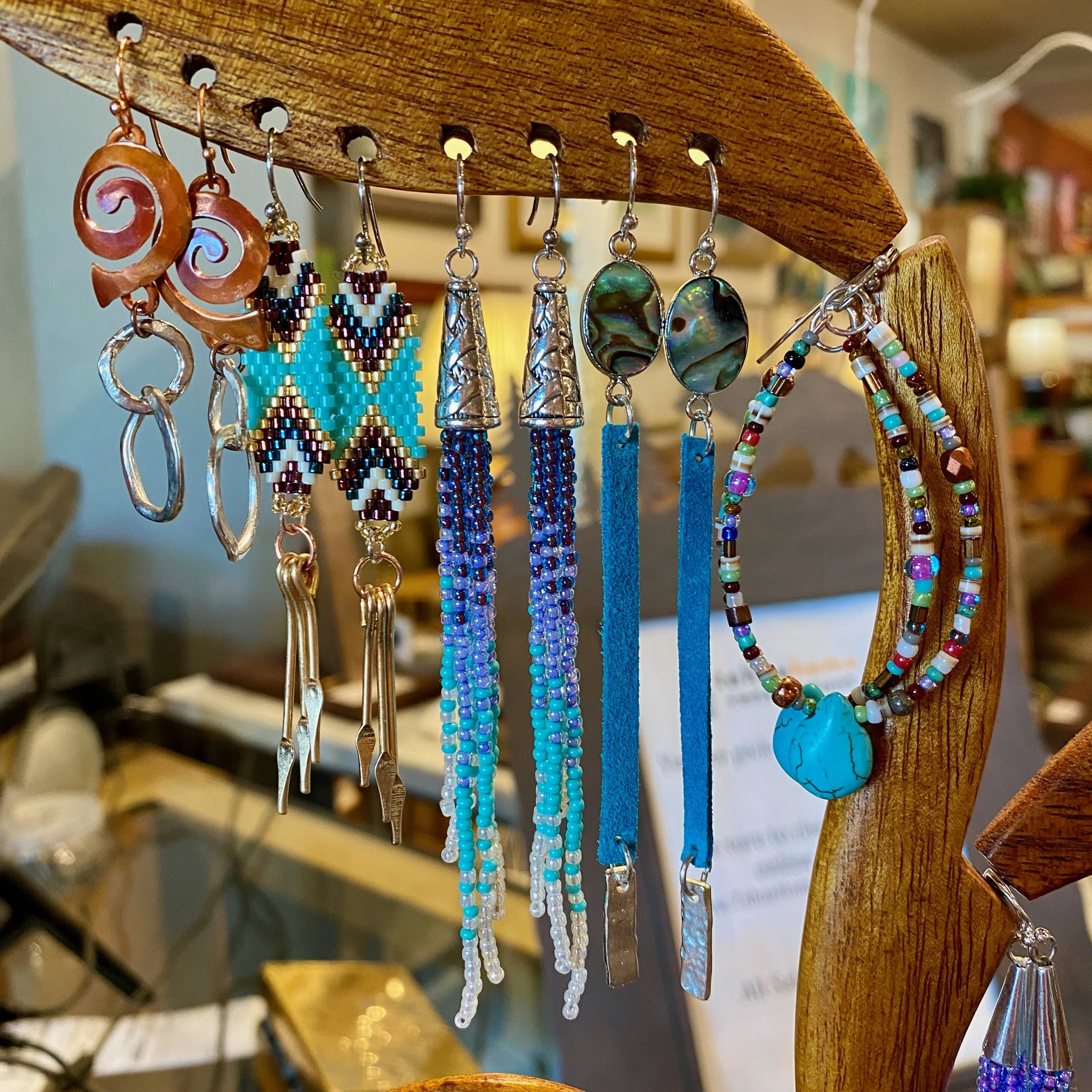 “I have been saying to myself for some time, ‘I think I could make that!’ when browsing jewelry during my travels around town or around the world (and this has lead to an extensive personal collection of earrings and necklaces, which I cannot ever possibly wear entirely!) The day I walked into Tahoe Home Consignment wearing my latest creation of earrings - changed my whole thought about making jewelry to sell. Now, instead of making gifts, I get to spend my retired educator days creating and discovering happy mistakes that end up on the earring tree or necklace holder for sale.